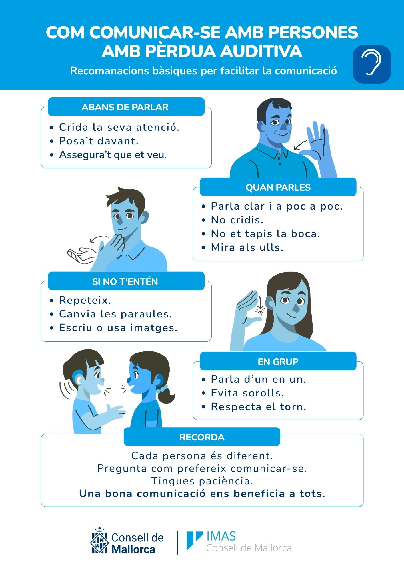 El Consell de Mallorca pondrá a disposición de todos los municipios un cartel informativo impulsado por la Oficina de Promoción de la Accesibilidad Universal (OPAU) del Institut Mallorquí d’Afers Socials (IMAS), en el que se recogen una serie de recomendaciones básicas para facilitar la comunicación con las personas con discapacidad o pérdida auditiva, una nueva herramienta que tiene como objetivo garantizar la plena inclusión y el acceso a la información.