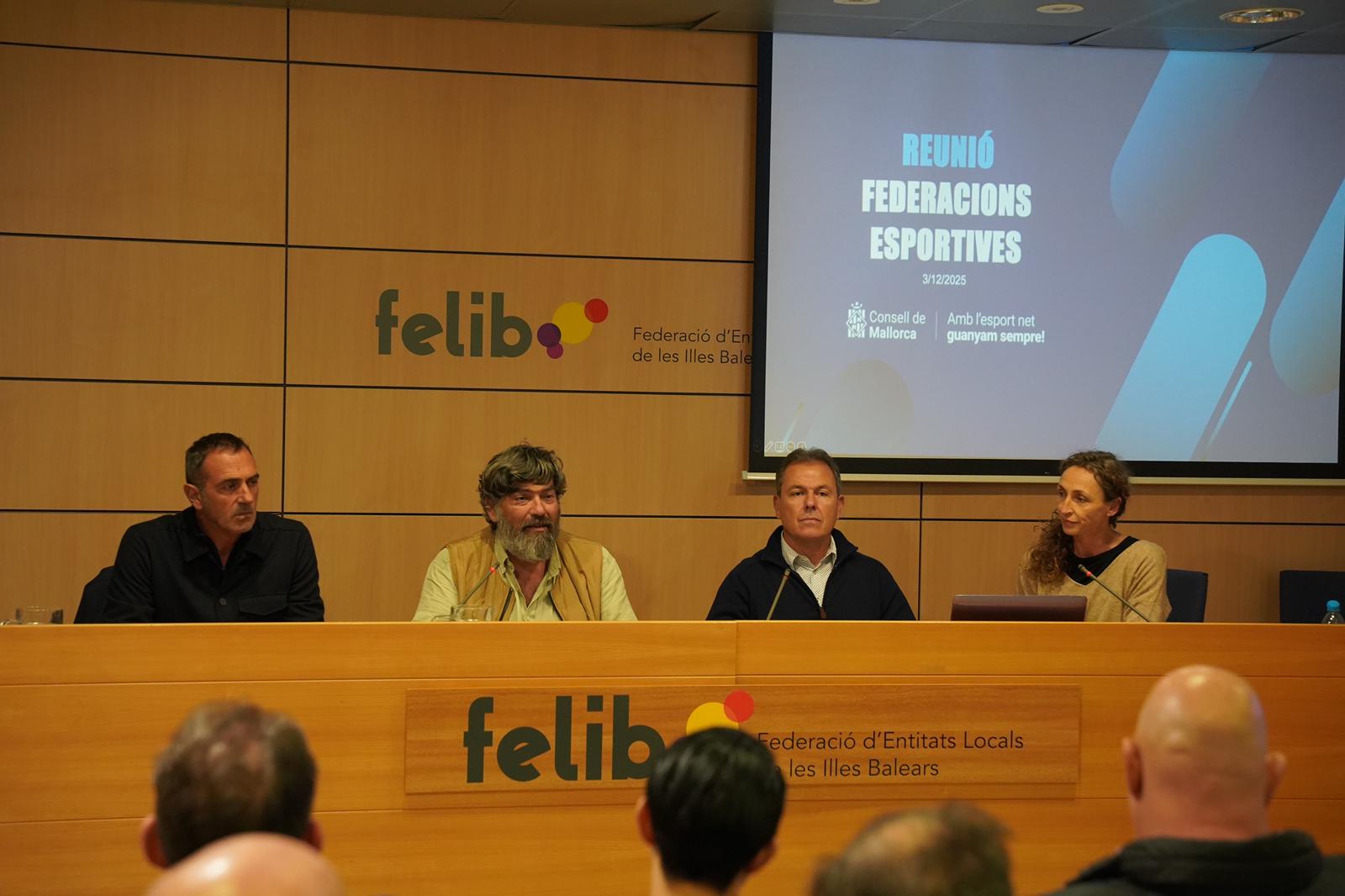El vicepresident segon i conseller de Medi Ambient, Medi Rural i Esports del Consell, Pedro Bestard, acompanyat del director insular d’Esports, Toni Prats, i dels tècnics esportius de la institució, s’ha reunit amb les federacions beneficiàries en la seva trobada anual i han repassat les activitats més destacades i les novetats 2026.