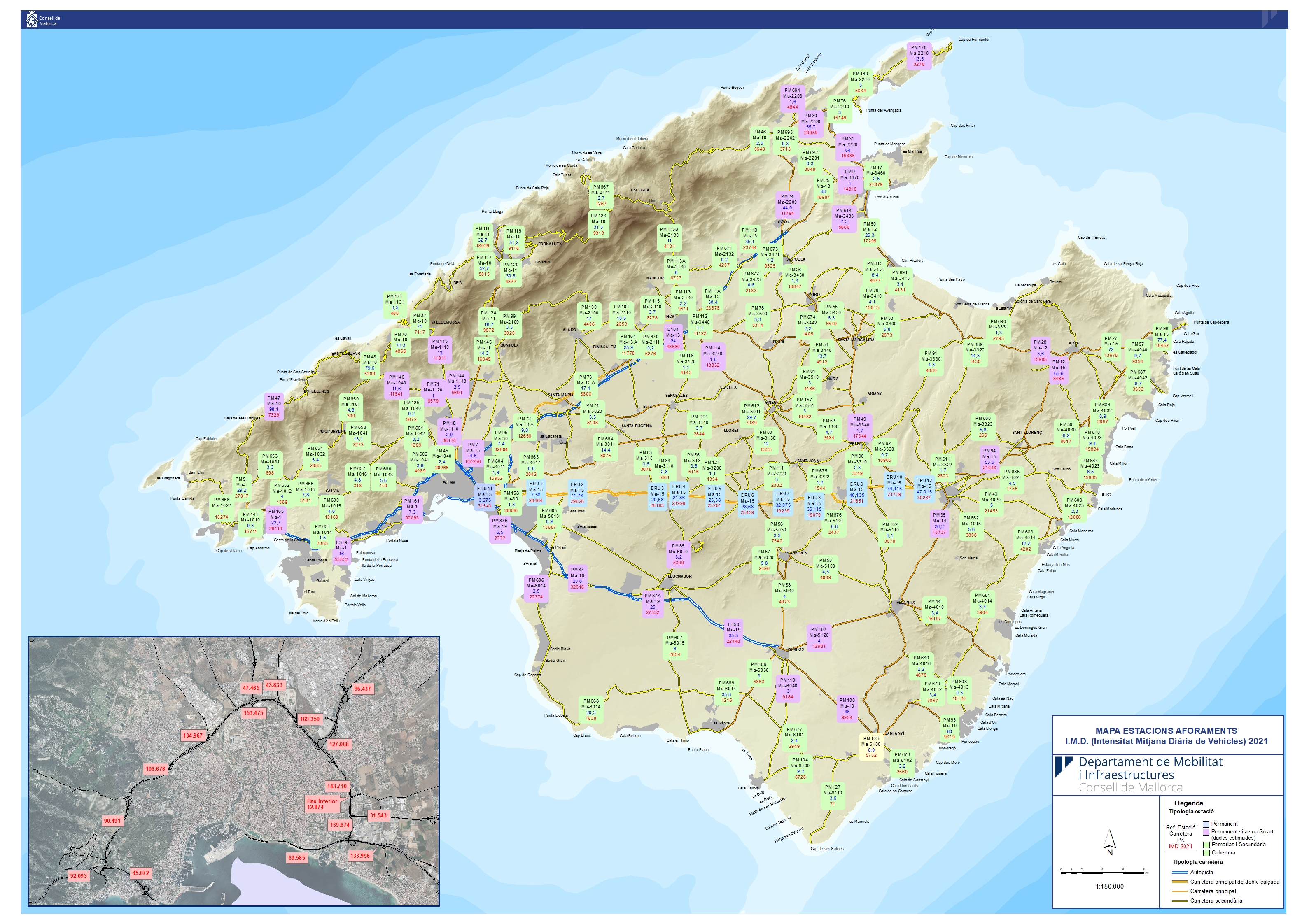 També teniu a la vostra disposició un mapa de la xarxa viària de Mallorca, un altre que especifica les limitacions de tonatge a les carreteres de l’illa, els mapes de la intensitat mitjana diària dels últims anys, així com un visor d’incidències.